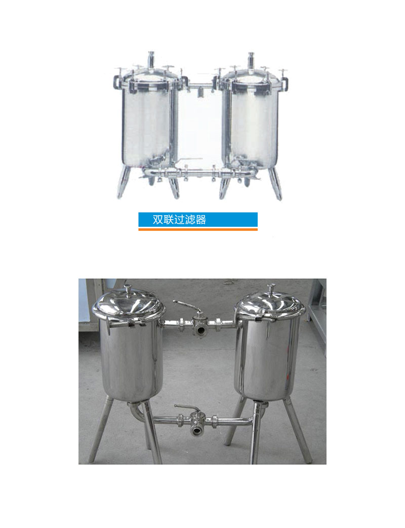 雙聯(lián)式過濾器全部采用SUA304優(yōu)質(zhì)不銹鋼制造,是二只圓柱體組成,內(nèi)外表面拋光0.4μm,頂部裝有壓力表、排氣閥,適用于除去鮮奶、糖液、飲料、口服液等液體中各種肉眼看不見的固體雜質(zhì)的凈化。兩只過濾器交替適用,可在不停機的情況下更換過濾網(wǎng),適于長期連續(xù)生產(chǎn)。